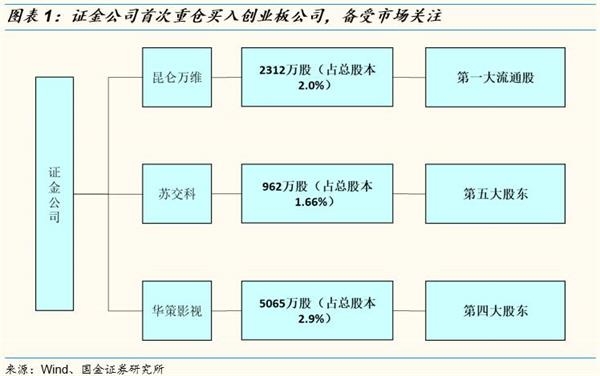 证金公司作为“国家队”的主力,首次重仓买入创业板公司,备受市场关注。证金公司首次以“中国证券金融股份有限公司”的身份新进入创业板公司的十大股东中,截止7月27日,新进入昆仑万维、苏交科和华策影视的十大股东名单,分别买入2312.53万股、962.49万股和5065.25万股,持股占比2%、1.66%和2.9%。并且,证金公司一跃成为昆仑万维的第一大流通股东,华策影视和苏交科的第四大和第五大股东。