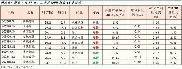 截止2017年7月27日,二季度QFII持有9支股票分别为:安琪酵母、水井坊、南京化纤、老板电器、西藏珠峰、华策影视、洛阳钼业、歌尔股份、海康威视。