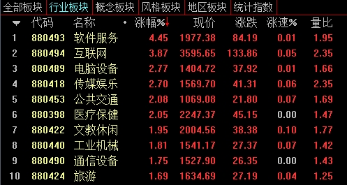 板块方面,以创业板个股为主的软件服务、互联网、电脑设备、传媒娱乐等板块涨幅居前。