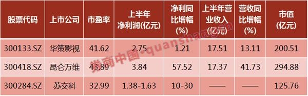 3、营业收入均超过10亿元,华策影视和昆仑万维上半年营收分别为17.51亿元和17.37亿元,苏交科还未公布半年报;