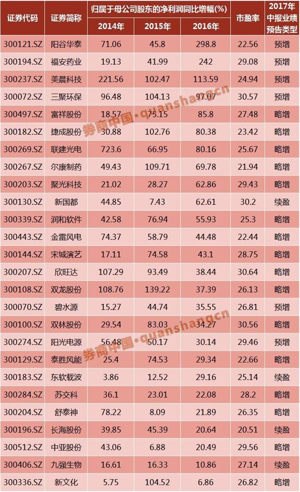 据证券时报网统计,创业板中有26只个股2014年至2016年归属母公司股东的净利润都呈增长态势,2017年半年报业绩预告类型属于预喜,且最新动态市盈率小于30倍。