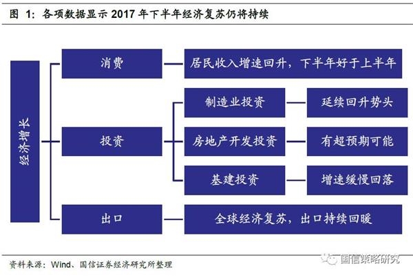 展望2017年下半年,我们预计经济复苏仍将持续,理由包括:(1)制造业投资和出口增速在明确的回升势头中,目前没有任何证据表明拐点会出现。(2)最新的数据显示今年上半年的居民收入增速已经出现了明显回升,预计下半年整体消费会好于上半年。(3)从房地产销售和目前的土地出让情况来看,下半年房地产投资有进一步超预期的可能。(4)大概率增速处于下行通道的是基建投资增速,但目前回落的速度非常缓慢。