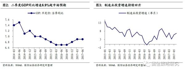 第二,固定资产投资总量增速回升,制造业和房地产开发投资增速在回升,基建投资增速缓慢回落。市场之前对于2017年经济下行的担忧主要来自基建和房地产投资下行带来的固定资产投资增速潜在下行冲击。但从现在的情况来看,上半年基建投资累计增速16.9%,基建增速下行的非常缓慢,甚至16.9%的增速还是要高于2016年全年15.7%的增速。而房地产开发投资增速上半年累计同比8.5%,比去年全年提高1.6%,仍在回升过程中;制造业投资增速上半年累计同比5.5%,比去年全年提高1.3%。