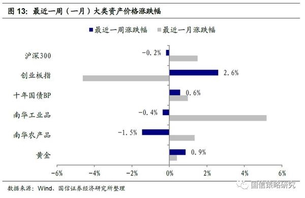 上周各大类资产价格中,股票市场表现分化,十年国债价格下跌,商品市场表现同步,金价回升。股票市场中,沪深300指数下跌0.2%,创业板指数反弹2.6%。债券市场中,十年国债到期收益率上涨0.6 BP。商品市场表现同步,南华工业品指数下跌0.4%,南华农业品指数下跌1.5%。黄金价格继续回升0.9%。