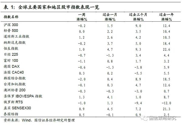上周全球各主要股票指数中发达国家市场股市涨跌不一,其中标普500指数上涨0.0%,恒生指数上涨1.0%,日经225下跌0.7%,德国DAX下跌0.6%,法国CAC40上涨0.3%。新兴市场国家股市多数上涨,圣保罗IBOVESPA指数上涨1.3%,俄罗斯RTS指数下跌1.0 %。