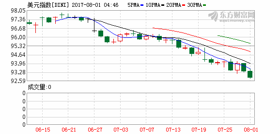 美东时间周一(7月31日)美元指数继续走低并失守93整数关口,美国公布的成屋销售和达拉斯联储商业活动指数均表现强劲,但数据公布之后美元却转而急挫。主要非美货币欢呼雀跃,美元兑日元延续跌势,触及逾六周低位;欧元兑美元扩大涨幅至0.7%,触及逾两年半高位1.1844.