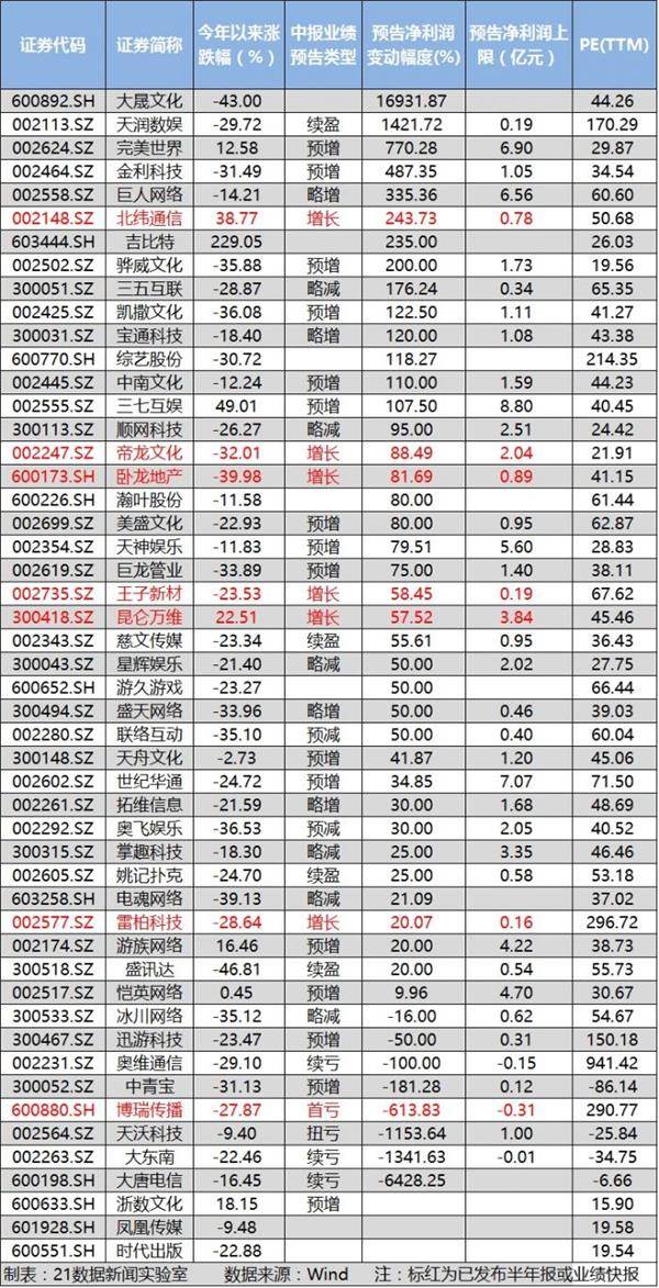 从业绩上来看,有14家公司预增涨幅超过100%,相对而言,游戏品质、口碑较好的龙头企业业绩较为稳定,不过,国内游戏市场竞争环境加剧,渠道规则转变,而且多数游戏上市公司市盈率较高,应注意其中风险。