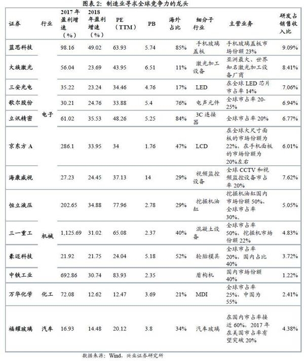 l 制造业寻找拥有全球竞争力的龙头,具备从规模优势到创新升级的优势。