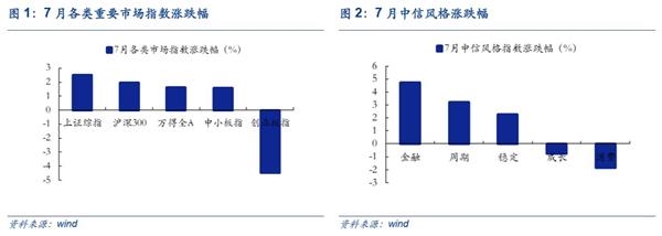 7月A股市场出现分化,大盘上扬而创业板回落。7月市场整体上涨,万得全A月涨幅1.61%,报收4428.31;其中,上证综指、中小板指月涨幅分别为2.52%、1.56%,收于3273.03、7054.96,;创业板指回落,月跌幅4.50%,收于1736.30.