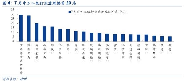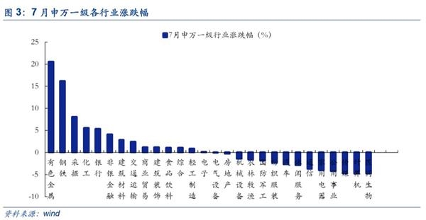 7月涨幅前五的行业分别是有色金属(20.56%)、钢铁(16.23%)、采掘(8.07%)、化工(5.56%)、银行(5.36%)。跌幅前五的行业分别是医药生物(-4.75%)、计算机(-4.75%)、传媒(-4.70%)、公用事业(-4.25%)、家用电器(-3.99%)。