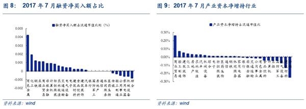 杠杆买入方面:7月以融资净买入额占流动市值比例代表杠杆投资,行业前五为有色金属(0.42%)、化工(0.19%)、钢铁(0.12%)、商业贸易(0.11%)和采掘(0.11%);后五为综合(-0.08%)、机械设备(-0.06%)、家用电器(-0.06%)、公用事业(-0.05%)和轻工制造(-0.03%).
