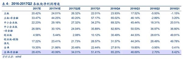 2017Q2主板增速预增,主板非金融增速预减,创业板和中小企业板增速预减,金融板块利润回升或是关键。截止目前,我们预计2017年中报预告全部A股中净利润同比增长21.86%,2017Q2为20.48%,环比微幅下滑;剔除金融后2017H1和2017Q2净利润同比增速分别为40.99%和34.01%。其中,上半年金融股业绩持续好转成为A股盈利的重要支撑。分板块来看,预计2017Q2主板净利润增速升至26.32%,主板非金融增速降至40.20%;中小板净利润增速降至27.32%,中小板非金融增速降至24.04%;创业板净利润增速降至2.08%低位,剔除温氏股份后回升至21.73%,较Q1仍是下滑。简而言之,创业板和中小板相较2016年同比增速均出现一定回调,主要原因是2016年的高基数与成长股盈利的负面预期;主板将成为A股盈利的最大亮点,增长主要来源是金融机构的资产负债表修复带动利润回升,预计2017年主板净利润同比增速20.42%,明显高于2016年。