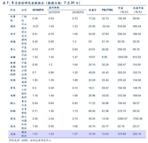 ■行业配置建议:关注新能源车、交运、金融和电子。8月建议关注新能源车、交运、金融和电子等行业。8月市场仍需要谨慎,流动性环境中性偏紧,市场情绪依然较为敏感,行业配置重在挖掘结构性机会,建议关注新能源车、交运、金融和电子等行业。具体而言,8月建议持续关注有色和新能源汽车板块。同时,金融监管仍在路上,利率并未见顶回落,8月整体偏调整,建议积极布局防御性质较强的金融板块。另外,我们认为交运行业的配置价值正在凸显。传统淡季结束,在全球经济回暖的背景下BDI开启年内第二轮上涨,上半年国内交运数据欣欣向荣,下半年预计仍处于景气上升通道。同时,目前强周期估值偏高,在周期轮动的趋势下不妨关注当前估值仍在安全边际内且处于后周期板块的交运行业,细分行业中航运(PE:25.3,中位数37.2)、高速(PE:15.13,中位数14.15)估值合理,物流行业持续高增长(上半年全国社会物流总额为118.9万亿元,同比增长7.1%),下半年随着消费需求增长强劲(节日促销、双11以及年底消费),预计物流需求保持30%以上的高速增长,叠加平台整合以及国企改革等热点话题,值得格外重视。此外,考虑到下半年苹果产业链拉动以及国内手机厂商下半年出货放量,消费电子迎来旺季,行业景气度达到新高度,结合目前行业估值偏低(PE45.09,中位数49.41),值得密切关注。