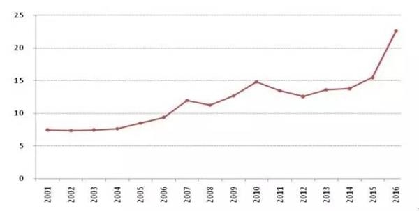 2016年,我国土地成交均价快速上涨,同比增长24.1%,而同期居民消费价格指数仅增长2.0%,地价增幅/CPI增幅达到12.1。从历年土地均价增幅与CPI增幅间的关系来看,在地价合理期的2005-2013年间,土地成交均价增幅与CPI增幅间的比值为5.1.2016年该指标的偏离度为137.3%,尽管远低于日本房地产泡沫期290.9%的水平,但我国的房价和地价增速已远远超过了一般物价的波动,应警惕房价和地价的过快增长。