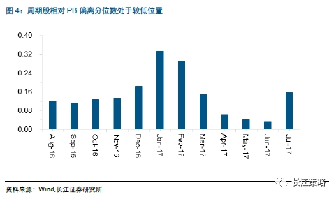 关于估值,目前周期股估值仍有修复空间。根据我们构建的相对PB-ROE估值体系,现阶段周期整体PB-ROE的偏离程度分位数为15.7%,说明相对于当前的ROE情况来看,目前周期股的PB仍然处于比较低估的区间,因而,仍有持续修复的空间(具体参见20170803《周期股估值贵了么?——八月行业配置报告》).