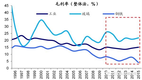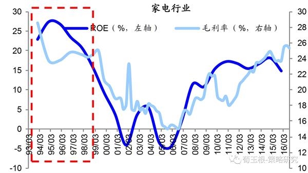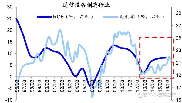 产业不断更替,制造业中高毛利的子行业不断变化。现在曹德旺抱怨国内税负高,企业负担压力大,但是回头看,在80年代中后期福耀玻璃毛利率曾经高达90%左右。随着时代的变迁,技术的革新,产业周期的变化,玻璃行业高毛利的时代已经过去,现在玻璃等传统制造业盈利逐渐下滑,企业负担压力增大。在《十年一片天:产业周期跨越股市牛熊-20160225》中曾经分析,产业周期十年一个轮回。1990-2000年是消费制造时代,以消费制造业为主导。2000-2010年是工业制造时代,加入WTO以及城镇化率带来的房地产产业链的大发展使得工业制造行业迎来加速发展。2010年之后则进入了智能制造的时代,此前主流的传统制造业盈利能力出现了明显下滑,工业企业利润率从6%左右下降到了5.5%,A股工业行业的净利率从6左右下降到了4%附近,传统的制造业已经沦为低端制造业,而技术含量高的高端制造业则保持了较高的盈利水平。以上市公司为样本,可以看出制造业的轮动情况。消费制造时代的代表家电行业在90年代ROE和毛利率均保持较高水平,最高分别为27.4%和28.5%,01-05年ROE跌至0附近,毛利率最低也下滑至15%。而工业制造时代的代表工程机械行业,其ROE和毛利率水平从02年开始震荡上行,一直到11年底见顶开始下滑。代表智能制造的通信设备制造业,ROE和毛利率均保持了一个很好的回升态势,目前ROE为8.2%,毛利率为21.4%。综上可以看出,产业周期性变化的过程中,旧的产业盈利能力逐渐下降,而新的产业则会有高的盈利水平。