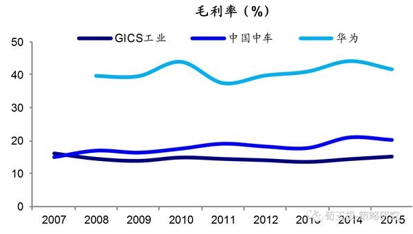 制造业内部分化明显,高端制造盈利能力好,低端制造盈利能力差。当下时点看,传统的低端制造业盈利能力确实在逐步恶化,上市公司中工业行业整体的ROE从10年的13.4%下滑到15年的7.3%,福耀玻璃所处的玻璃行业在10年也结束了上升趋势开始下滑,从高点的13.8%下滑到15年的2.1%,其他制造行业如钢铁行业也从7.0%下滑到-12.3%。毛利率方面,工业整体从08年开始就已经下滑到了15%左右的水平,而玻璃行业10开始下滑从10年的25.9%下滑到15年的21.8%,钢铁行业则从07年开始明显下滑,从07年的13.2%下滑到15年的4.1%。但是并非所有的制造业盈利都变差了,中国中车代表的中国高铁行业在世界范围内占据重要地位,其盈利能力明显较强,10年至今ROE维持在12%左右的水平,毛利率则从15%提升到了23%,均要优于工业整体的水平。相似地,华为作为全球重要的科技设备制造商,其技术实力是雄厚的,最近其领导的Polar Code码成功作为5G中控制信道的编码方案,中国通信公司首次在全球通信技术协议中占据一席之地。15年华为的ROE高达31%,07年至15年平均也高达27.6%,毛利率则稳定在40%左右的水平,均明显优于工业整体的水平。