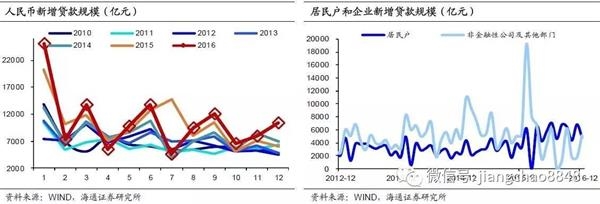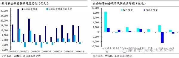 12月新增金融机构贷款1.04万亿,同比多增4466亿。其中前期地产销售端回落、贷款政策趋严的影响开始显现,居民中长贷从高位回落至4200亿;但商品涨价、库存回补推动经济短期稳定,实体投资意愿有所改善,再加上12月贷款对债券发行形成一定替代、以及地方债发行冲击减弱,非居民中长贷增加近7000亿,短期信贷仍有支撑。但从16年全年来看,信贷增长45%来自房贷,如今房贷已开始回落,在17年年初信贷冲量以后,未来回落风险较大。
