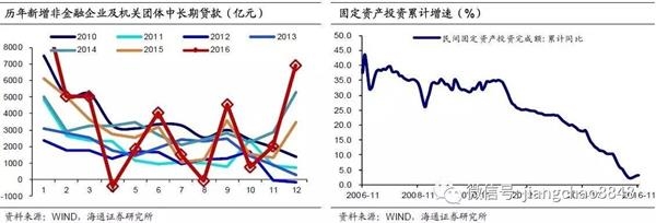 但短期来看,企业中长贷对信贷仍有支撑。12月非金融企业及机关团体贷款增加5095亿,其中短期贷款增加541亿;票据融资大减2538亿,与未贴现汇票继续大增相对应,反映企业更多转向表外票据融资;中长期贷款增加6931亿,增幅仅次于1月份,为近几年同期最高点。商品价格上涨、库存回补带来经济短期回暖,企业投融资意愿边际改善,再加上12月贷款对债券发行形成一定替代、以及地方债发行冲击减弱,共同支撑了12月企业中长贷的高增长。往前看,预计受年初冲量、银行储备项目集中释放推动,17年初信贷增长仍有支撑,但随着房贷增长减弱、经济下行压力显现,之后信贷回落的风险较大。