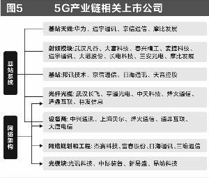 根据对3G、4G建设中二级市场相关标的的表现,5G也将会存在主题投资和业绩兑现两个阶段。其中,以工信部发放牌照和频段为分水岭,之前为主题投资,之后为业绩兑现投资。主题投资阶段关注白马股或者预期最受益的上市公司。进入业绩兑现期除关注白马股以外,要关注主题投资阶段涨幅小,业绩兑现丰厚的上市公司,或者主题投资阶段涨幅大,但是业绩兑现大幅度超预期的公司。相关产业链上上市公司如图5。笔者根据细分行业的变化大小,相关企业的发展战略靠拢5G程度,以及涉及5G业务规模占比大小为参考标准选取部分上市公司,供投资者参考。