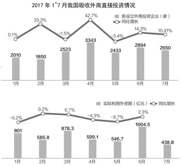 8月15日,商务部外资司负责人介绍了2017年1~7月我国吸收外资的情况。2017年1~7月,全国新设立外商投资企业17703家,同比增长12%;实际使用外资金额4854.2亿元人民币,同比下降1.2%。