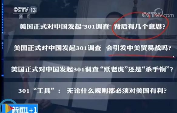 王宁:观众朋友晚上好,走进正在直播的《新闻1+1》,这两天有一个数字把中美两国捆在了一块,只不过这个数字变成了一根刺扎着对方,那这个数字就是301,我们看到就在几天之前,美国的贸易代表办公室特别的宣布要对中国的贸易行为展开所谓的301调查,这是一个什么样的调查,这个调查有什么样的来头呢,我们来给大家简单的介绍一下。