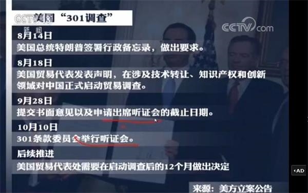 王宁:所以我们看到它这次选择的是三个领域,一个是创新领域,一个是技术转让,一个是知识产权问题,它是以这几个理由作为优先,但实际上背后还是刚才您所提到的中美贸易长期存在的不平衡的问题,就是逆差这个问题,那下来我们就要重点关注一下了,在“301调查”开始进行期间,我们的中国有没有一些筹码在手上,我们有什么样的应对措施,现在我们说箭在弦上,要马上让它让步是不可能的,接下来我们该怎么做就变成了核心。我们来继续往下看。