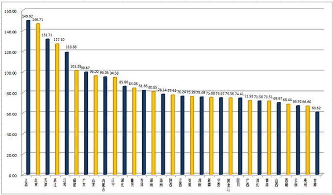 《报告》显示,在全国31个省区市中,上海、北京、天津、浙江、江苏和福建6个省份小康经济指数超过100,即这6个省份实现全面小康经济发展目标。小康经济指数最高的三个省市是上海、北京、天津,分别为149.92、146.71、131.71.