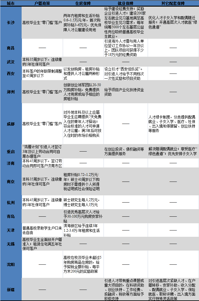 这些城市的政策五花八门却又相似,通过梳理不难发现:放开落户限制,给予住房补贴,成为这场人才战的入场券。