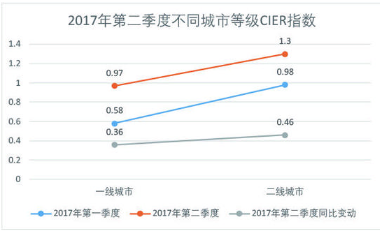 CIER指数(中国就业市场景气指数)也反映了二线城市人少职位多的情况。CIER大于1时,表示就业环境比较缓和,CIER小于1时,表示就业形势比较严峻,竞争者很多,2017年前两个季度,二线城市的CIER指数都比一线城市高。
