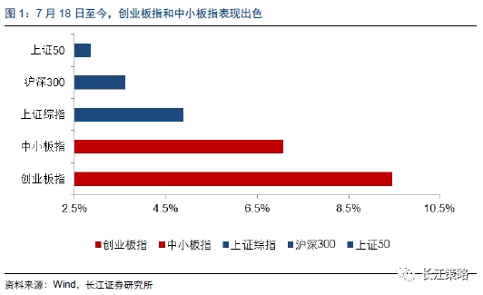 近期以创业板和中小板为代表的小盘股表现较为出色。7月18日至今,创业板指累计上涨9.44%,中小板指累计上涨7.07%,以中小创为代表的小盘股一改前期表现较差的态势,涨幅大幅领先以沪深300为代表的大盘股。基于此,本周周报将首先探讨本次中小创上涨的属性,并探究本轮中小创反弹带给周期和金融的启示。