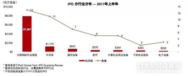 2017年上半年,行业融资额分布略有变动,互联网软件及服务行业处于领先地位,共有13起IPO,融资总额约79亿美金,占据了全球科技企业IPO融资总额的半数以上。排名第二的为半导体行业,共有11起IPO,融资总额约为12亿美金。通信设备行业排名第三,共有7起IPO,融资总额约为6亿美金 .