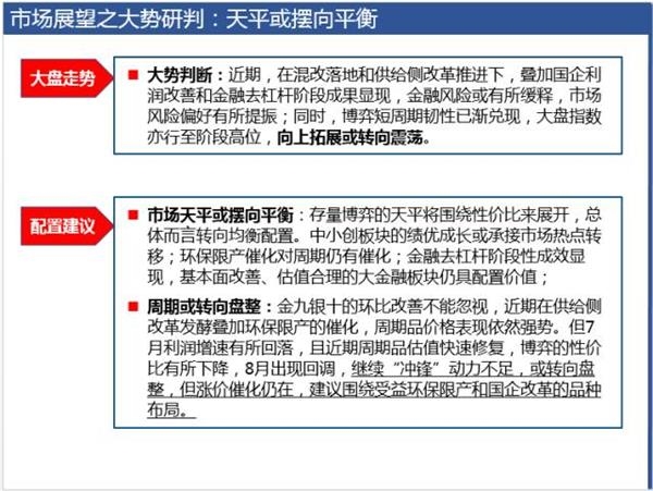 配置上,建议均衡配置,关注超跌绩优成长,大金融仍是必备品种,周期建议围绕环保限产挖掘景气品种(煤改气、大气治理、水环境治理、化工、煤炭、有色、建材优选品种);主题上,建议继续关注国企改革(混改推进、央企重组、地方国改提速)、京津冀一体化(下半年重要节点催化)等。