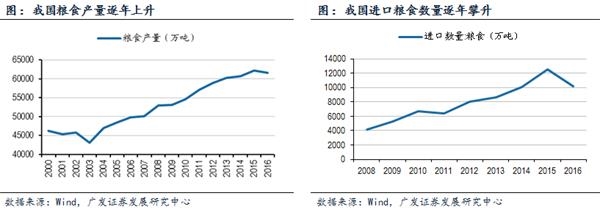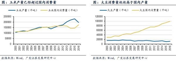 供求结构性失衡最为典型的两个产品为玉米和大豆。自2011年以来,政府连续提高玉米的临储收购量,一方面造成库存过剩,另一方面价格形成机制紊乱,农民在供给过剩的情况下继续增加生产,产生供给过剩。而大豆则呈现供给不足与减产并存的困局,目前我国大豆自给率低于20%,严重依赖进口。由于大豆价格不高,农民生产积极性不高,国内大豆产量逐年下降至不到1200万吨,远低于消费量。