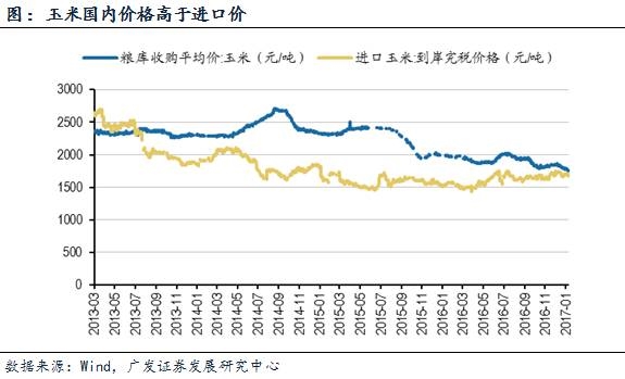 过去几年农产品成本攀升带来的直接影响是造成国内价格的上涨,叠加国际粮价大幅下跌、国际航运价格下跌、汇率等综合因素,共同造成了国内外农产品价差较大的现状。以玉米为例,2014年价差最高时国内粮库收购平均价比国外进口到岸完税价格高出1000元/吨(近65%),价格的倒挂对国内农业发展产生了较大的压力;2016年底国内外价差收敛后,国内粮库收购价格相比国外进口差价仍超出100元/吨。