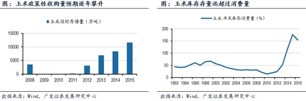 当前粮食最突出的问题在玉米,2015年末玉米库存已达到消费量的1.76倍。改善供需失衡的首要举措是玉米去库存,并大力发展玉米深加工。