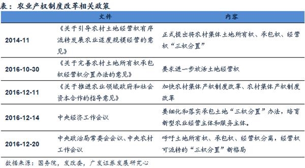 农业供给侧改革持续推进的前提在于农业产权制度改革,这个是规模化经营及农业生产效率提升的基础,未来土地制度改革推进下的土地流转板块将持续受益;