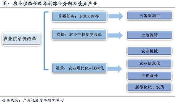 农业供给侧改革的本质体现为确保粮食安全、农民增收、去库存的基础之上推进农业现代化与规模化。我们认为,农业供给侧改革的产业路径可依次分解为:1)短期任务:农产品去库存、改善农产品价格形成机制,当务之急是推动供求关系失衡最严重的玉米去库存;2)制度基础:农业产权制度改革,在土地制度改革推进的背景下加快土地流转;3)中长期远景:农业现代化与规模化,推动高端农业机械、农业信息化、生物育种及新型化肥、农药等产业发展。