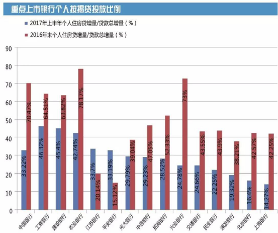 比如2016年底,有6家上市银行将新增贷款中50%以上的额度投向了个人住房贷款(即个人按揭贷),而2017年上半年这些银行都大幅缩减了投放额度。