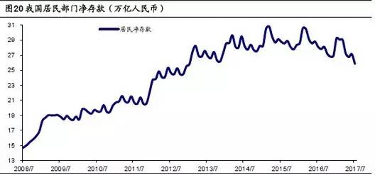 姜超并指出,从存贷比的角度来看,居民加杠杆的空间也越来越小。存款可以反映居民的资产和财富状况,贷款可以反映负债状况,所以居民存贷比可以衡量举债和偿债能力的变化。从09年以后我国居民的这一比例就在大幅上行,截至今年7月已经达到62%的历史高点。目前我国居民的存款余额约68万亿,贷款余额42万亿,净存款26万亿,这比16年初30万亿的峰值缩水了16%,已经降至13年初的水平,因此我们预计未来居民举债空间将会越来越小。