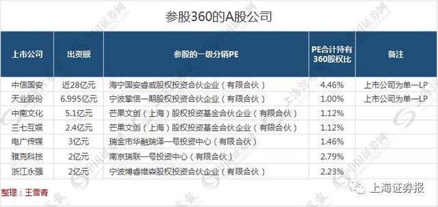 从上市公司披露的信息来看,中信国安、天业股份、中南文化、电广传媒、三七互娱、雅克科技、浙江永强、炬华科技等均有参股。参股途径为:上市公司直接或间接作为有限合伙企业的LP,相关有限合伙企业直接持有360股份,并且同时通过奇信志成间接持有360的股份。
