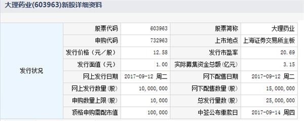 根据交易所公告,大理药业股份有限公司于2017年9月12日进行网上和网下申购。本次公开发行股票全部为新股,发行股份数量为2,500 万股。本次发行全部为新股,不进行老股转让。回拨机制启动前,网下初始发行数量为1,500 万股,占本次发行总量的60.00%;网上初始发行数量为1,000 万股,占本次发行总量40.00%。
