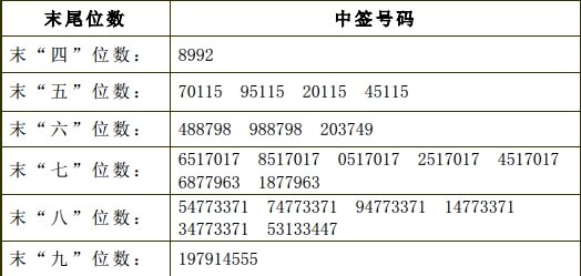 凡参与网上发行申购恒银金融 A 股股票的投资者持有的申购配号尾数与上述号码相同的,则为中签号码。中签号码共有6,3000 个,每个中签号码只能认购1,000 股恒银金融 A 股股票。