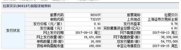根据交易所公告,上海拉夏贝尔服饰股份有限公司于2017年9月13日进行网上和网下申购。本次公开发行股票全部为新股,发行股份数量为5,477万股。本次发行全部为新股,不进行老股转让。回拨机制启动前,网下初始发行数量为3,833.90万股,占本次发行总量的70%;网上初始发行数量为1,643.10万股,占本次发行总量的30%。