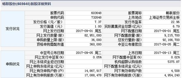 根据交易所公告,上海畅联国际物流股份有限公司于2017年9月13日起在上海证券交易所主板上市交易。