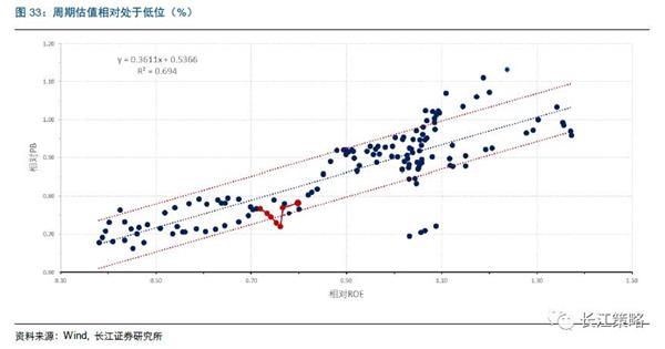 从估值的角度来看,目前周期整体的估值仍然处在比较低的位置。根据我们建立的相对PB-ROE估值体系(详见我们前期的行业比较报告《周期股估值贵了么?——八月行业配置报告》),虽然周期股的PB前期有所上升,但是相对于当前盈利来看,目前周期股估值情况仍然处于比较低的状态,并没有出现显著的上升。