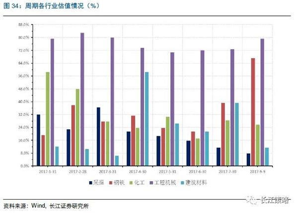 分行业来看,仅有钢铁行业估值出现了大幅度的上升,而采掘的估值有了进一步的下行,目前周期股行业估值从低到高排序为:采掘、建材、化工、钢铁、机械。