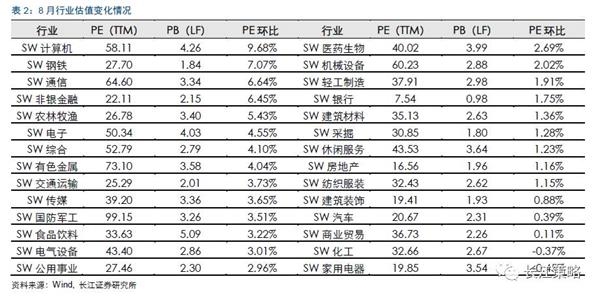 从月度变化来看,8月除家电、化工外所有申万一级行业估值均较上月上涨。其中,计算机、钢铁、通信估值提升位列前三位,估值分别较上月上升9.68%、7.07%与6.64%,此外非银、农牧、电子、有色估值分别较上月提升6.45%、5.43%、4.55%、4.04%。而估值较上月有所下降的行业有家电、化工,估值分别较上月环比下降0.45、0.37个百分点。而值得关注的是,化工行业目前估值32.66倍已稍低于历史中值水平33.82倍。