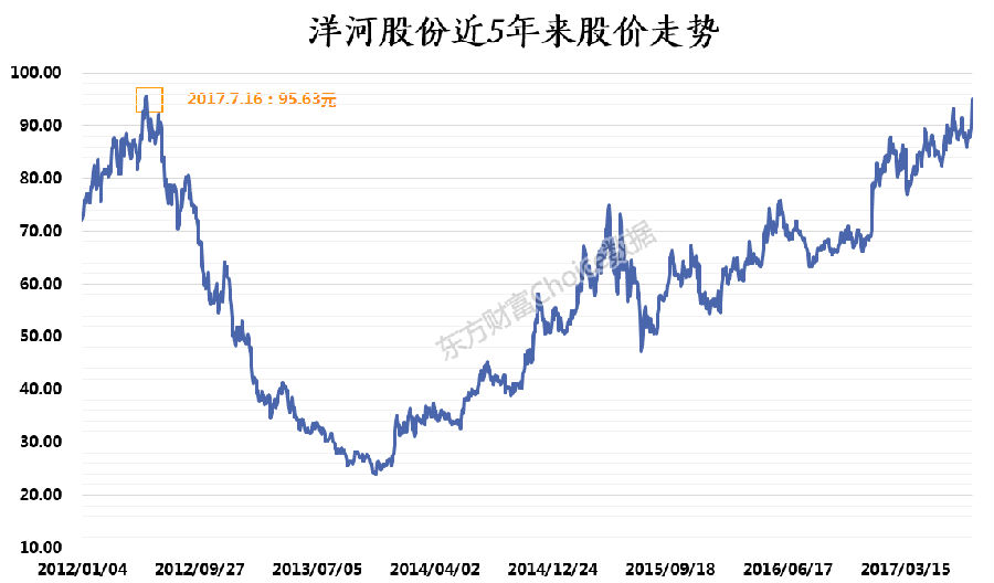 今年以来,洋河股份股价不断创下新高,9月20日收于95.00元,直逼2012年7月16日创下的上市以来最高收盘价95.63元,当天盘中股价最高至98.38元,刷新了上市以来最高价的记录,直冲百元大关。
