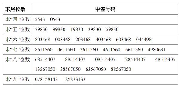 凡参与网上定价发行申购湖南九典制药股份有限公司股票的投资者持有的申购配号尾数与上述号码相同的,则为中签号码。中签号码共有 52,812个,每个中签号码只能认购 500股湖南九典制药股份有限公司股票。